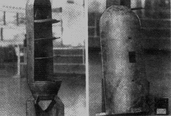 这种炸弹的形状,是在朝鲜和中国发表的所有细菌战说明中最常见的一种。这是两国当局收集的炸弹中最普通的一种。委员会的成员都多次看到过这种型号的样品。这种炸弹与一般美国造的500磅HE炸弹的尺寸和形状大致相同,其重量约为150磅左右,用手就可以往机枪里装栽。这种炸弹有一个圆锥形尖嘴,其尖端就是定时信管。尖嘴里面有一个小空槽,在它的下达连着圆筒形炸弹弹体。弹体内用三个钢板间隔成四个槽,围壁上有竖缝连接在合叶上的另一半,打开后可以在指定的时间投下装在里面的东西。最下层槽床的下面,围壁逐渐缩小,形成圆推形的空槽,空槽的外侧伸出4片尾翼。在它的下面装上降落伞时,开有一个降落伞能够出去的圆孔。公布的炸弹尺寸,各不相同(NCNA/85、SIA/13、ISCC/4等)。委员会看到的和被俘驾驶员所说明的炸弹样本,全长约4呎,直径1.2呎,围壁是用厚1吋的钢板制成。四个空槽的总容量约为14.5加仑。定时信管长约3吋多,标识是“传单炸弹,500磅,M105组,美制定时(信管)无内容”。据被俘飞行员的说明(附录37~40),炸弹的扇门大致在100呎高度就被打开,能在直径300呎的地面的土地上散发传单。