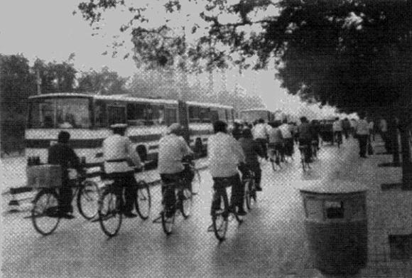 北京的清晨,自行车的铃声唤醒了我:从早上六点左右开始响起来,高潮是在七八点左右。我站在旅馆的窗口往下看去,自行车的洪流自西向东,像银色的河流流向城市的中心。由于过分密集,自行车群之间几乎没有间隙。到了黄昏时,这个洪流又反过来流动。绝大多数自行车是坚固的载重型的,轻便型的自行车为数极少。听说上海产的自行车比北京产的更受欢迎,要买上海产的自行车,得等上几个月才行。不仅自行车,电视、手表等工业产品,都是上海的质量好。