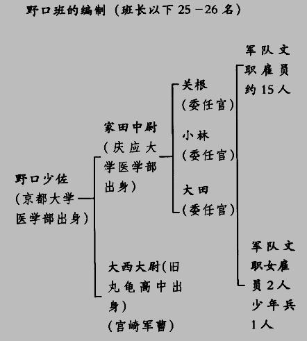 野口班是第四部第二课的通称。负责研究炭疽干菌。第四部在战争结束时的最高负责人是军医少将川岛。