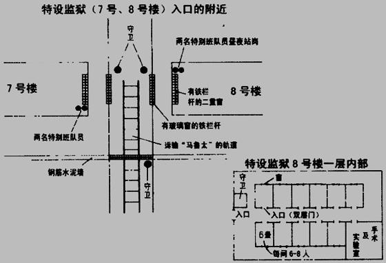 据这位特别班人员说,“特设监狱里虽说有地下室,但规模并不大”。关于这一点,另一位特别班人员提供的证词是:“‘马鲁太’是经由地下通道运进7、8号楼(特设监狱)的。地下通道有轨道车用的铁轨……从口字楼中央走廊通往7、8号楼,院子设有坚固的铁门,经常有警备人员在门旁站岗”。