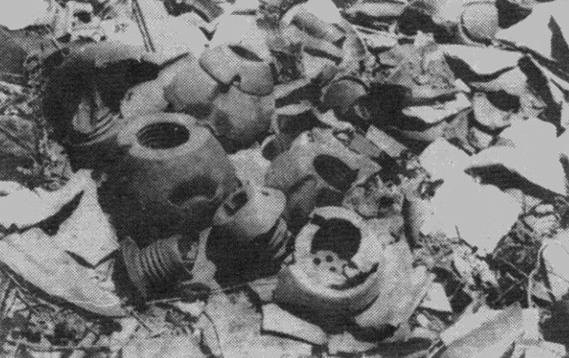 原731部队口字楼后面残存的大量石井式陶瓷炸弹碎片堆(哈尔滨市地方史学会提供)
