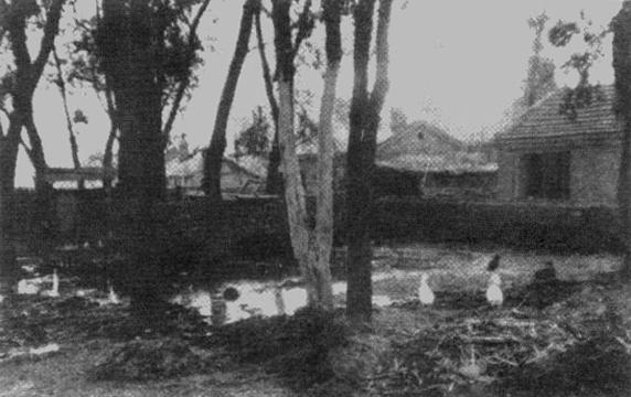 听着韩晓先生的说明,沿着校舍的右侧往后走。由于头一天夜晚下了雨,地面有积水,鞋子上沾满了泥泞。这时才明白平房区的人们都穿高统雨靴的原因——是为了陪同我们参观而早巳做了准备。