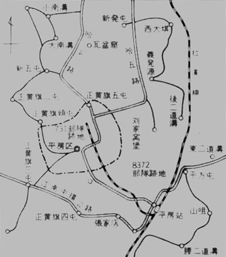 731部队坐落在平房的东北部,其占地面积内包括了21个村庄:即义发源、正黄旗五屯、正黄旗四屯、新五屯、瓦盆窑、大南沟、小南沟、正黄旗头屯、二屯、三屯、黄家窝堡、韩四家子、大乔家、三家子、张家店、平房屯、韩家店、腰二家沟、后二道沟、东二道沟和山咀,其占地共约80平方公里。