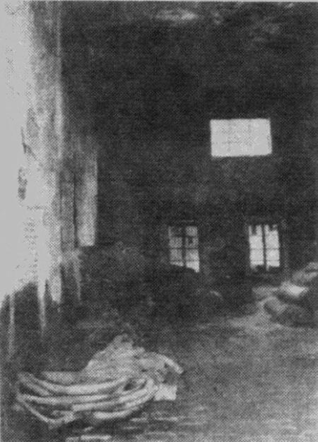 在天花板很高的屋里,只能从上方的小窗口透进一点光线来,室内阴暗。地上铺着一层石头,墙壁是厚厚的混凝土。现在是哈尔滨市新丰工厂的器材仓库。